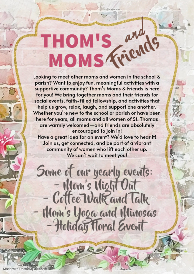 Thoms Moms is made up of the Moms and Grandmothers of our St. Thomas community. They host events every year like a Coffee Walk & Talk, Ladies Night Out, Momsgiving, Moms & Mimosas, and many more. All are welcome and encouraged to bring friends to join!